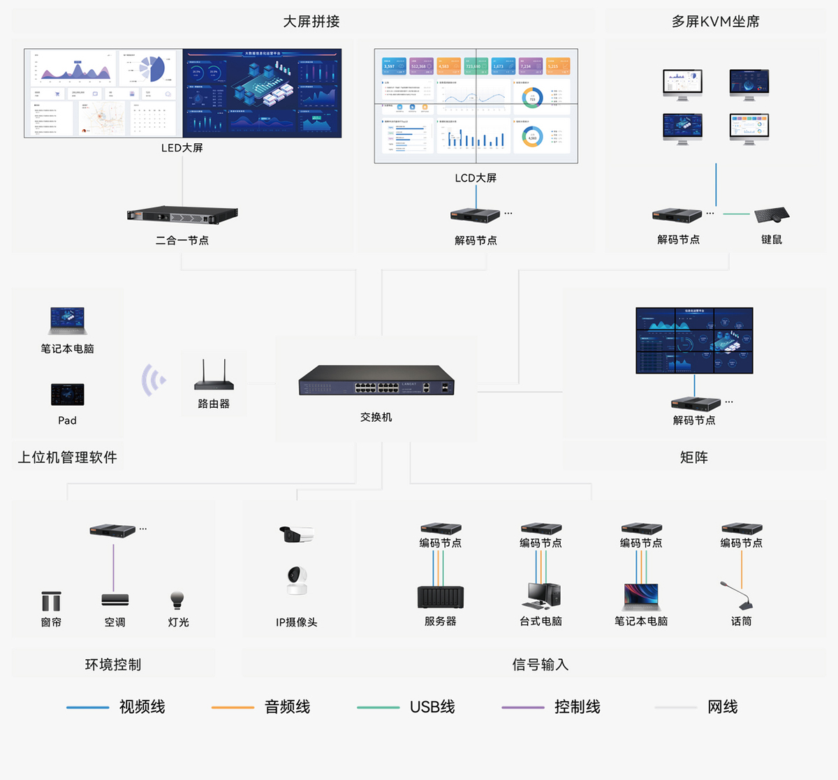 不需要依賴管理服務(wù)器,系統(tǒng)由編碼、解碼節(jié)點組成,集拼接、矩陣、坐席功能為一體。